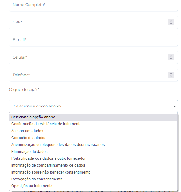 Este Canal é de uso exclusivo para dúvidas e solicitações sobre seus dados pessoais como: confirmação da existência de tratamento de seus dados pessoais, solicitação de correção, eliminação, bloqueio ou atualização de seus dados pessoais do nosso banco de dados ou revogar consentimento de uso de seus dados pessoais. Para outros assuntos, utilize o canal CONTATO.